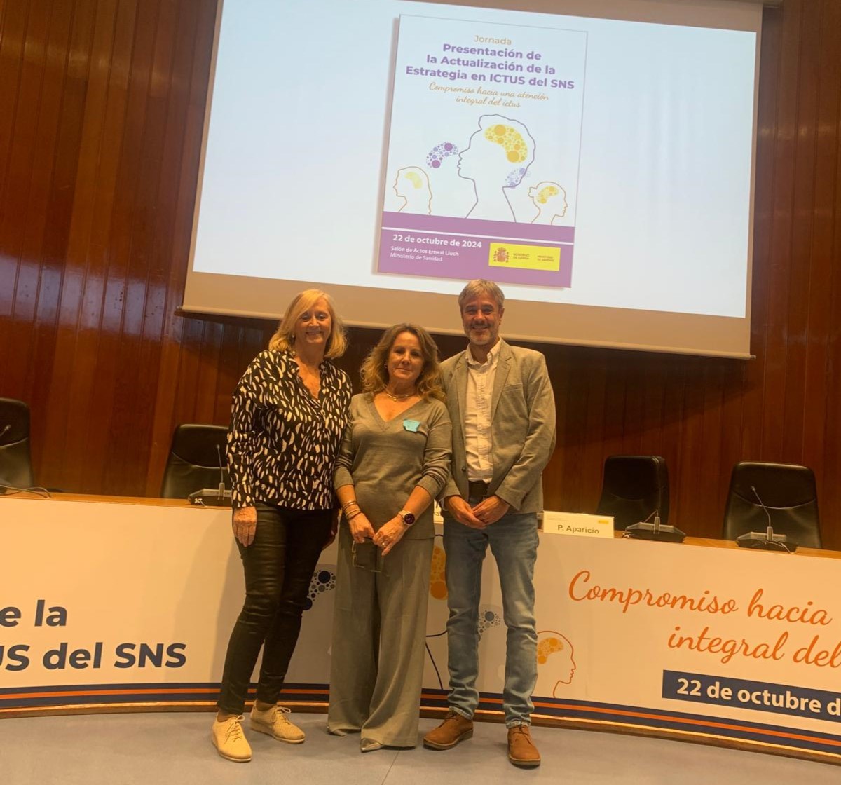 Foto: Gloria Martínez, representante institucional de Aragón en la Estrategia; Aitor Garay, Decano del CPFA; y Mª José Peña, Directora de Enfermería de AP del Sector III de Zaragoza.