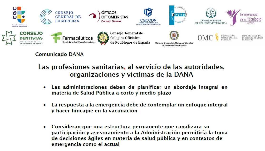 Desde el Colegio Profesional de Fisioterapeutas de Valencia se han puesto en marcha diferentes acciones de ayuda dirigida a sus colegiados afectados, entre ellas, una línea de voluntariado para damnificados que abre la posibilidad de colaborar donando materiales, alimentos, ropa, o tiempo como voluntario. El Colegio de Valencia a través de su página web canaliza estas ayudas.Más información