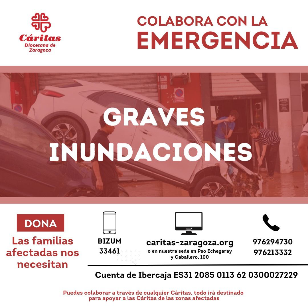 El servicio del 112 gestiona los voluntarios que se desplazan a Valencia y en cuanto a ayudas de tipo económico si lo deseáis podéis sumaos a las campañas de emergencia abiertas por Cruz Roja y Cáritas Española p.e. a través de Cáritas Diocesana de Zaragoza, en este último caso nos han indicado que se especifique en el concepto "EMERGENCIA INUNDACIONES" para que vuestra ayuda vaya dirigida a la tragedia de la DANA.